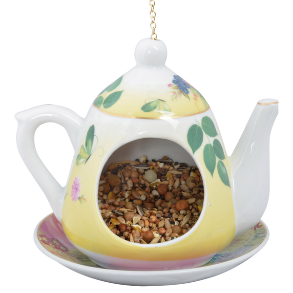 Teezeit für die Vögel! Großmutters Tee-Set bietet den Vögeln einen Futterplatz, der das Futter trocken hält. Die Teekanne verleiht diesem Futteraufhänger einen nostalgischen Look.